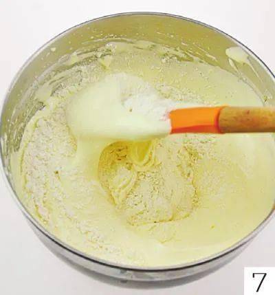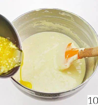 10倒入鲜奶油和黄油混合液,边倒边迅速由底向上翻拌匀,成蛋糕糊。