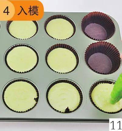 11将蛋糕糊倒入裱花袋中,挤入蛋糕模具中的蛋糕纸杯中,九分满。