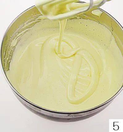 5继续中速搅打,至提起打蛋头,流下的蛋液可在表面划出8 字形,并在几秒后才消失,转低速再搅打1 分钟,消除蛋液中的大气泡,使蛋液变得更细腻。