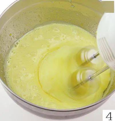 4在搅打过程中蛋液的色泽由黄色变为浅白色,体积也膨大1 倍。